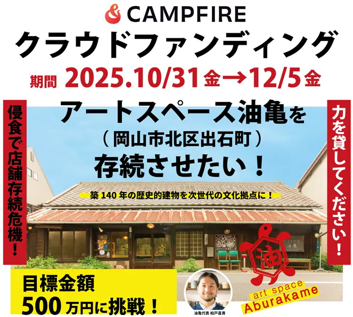 岡山・出石町にあるアートスペース油亀が、築140年の歴史的古民家(旧屋号:油亀屋)の存続危機に直面しています。 長年の雨による柱の腐食や傾きを受け、建物を緊急補強し、新たな文化発信拠点「油亀ラボ」へと進化させるためのクラウドファンディングを [...]