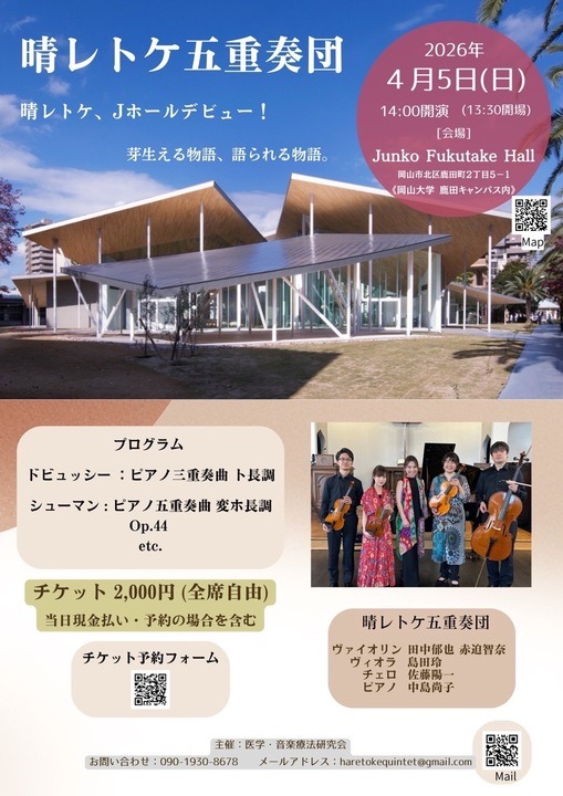 これから開催されるコンサート情報全て(リスト)3月のカレンダー今日開催明日開催今週末タグ:コンサートで絞りこみをしています絞りこみを解除絞りこみを解除アートアンティークいぬヴィンテージコーヒーコスプレコンサートさくらステージスポーツトークショーねこバザーパンひなまつりフリーマーケットペットホワイトデーマルシェライトアップライブワークショップ体験保護猫催事写真撮影動物古物子供向け展示展覧会映画服本桜植物歴史猫着物祭り花花火花見蚤の市講習会譲渡会車音楽飲食日付選択※日付の絞り込みをすると、他の絞り込みは解除されます全て本日日15 月16 火17 水18 木19 金20春分の日 土21 日22 月23エリアで絞り込みができます※エリアの絞り込みをすると、他の絞り込みは解除されます岡山市倉敷市津山市玉野市笠岡市井原市総社市高梁市備前市赤磐市真庭市美作市浅口市和気町早島町矢掛町奈義町吉備中央町イベントの並び順を変更できます日付順新規登録順人気順※地図・ジオコードの出典 晴レトケ五重奏団 Jホールデビューコンサート 〜芽生える物語、語られる物語。〜 開催迄21日 開催期間 2026/04/05~2026/04/05 参加予定 0 興味あり 2 考え中 0 岡山市 コンサート 音楽